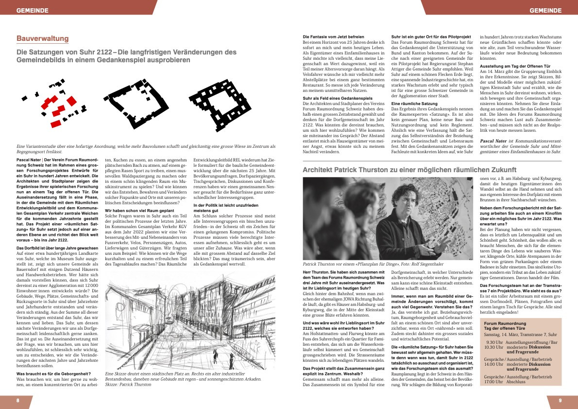 In der Lokalzeitung SuhrPlus orientiert Pascal Nater, Kommunikationsverantwortliche der Gemeinde, über das Pilot- und Forschungsprojekt des Forums Raumordnung Schweiz im Vorfeld des «Tags der offenen Tür» am Samstag, 14. März 2026.