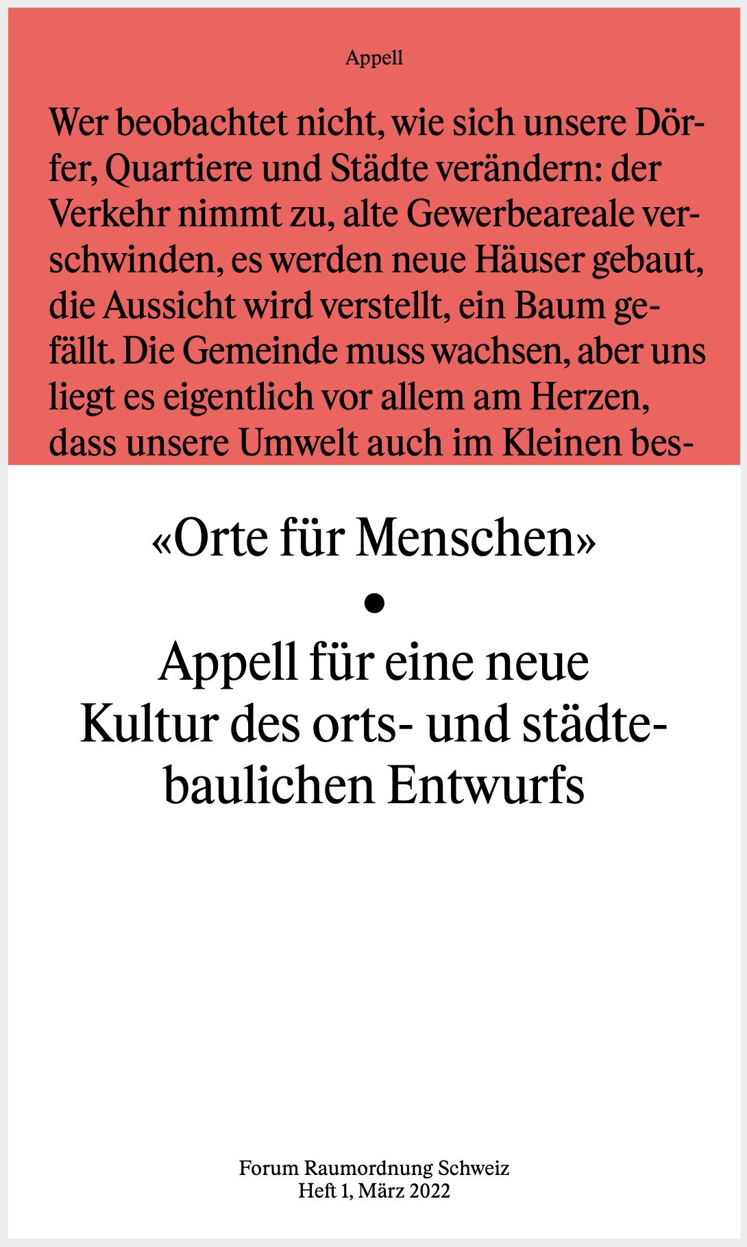 Als erste Aktion nach der Gründung richtete sich das Forum Raumordnung Schweiz mit einem "Appell für eine neue Kultur des orts- und städtebaulichen Entwurfs" an alle Deutschschweizer Gemeinden und Kantone. Die kleine Publikation ist auch in französischer und italienischer Sprache verfügbar.